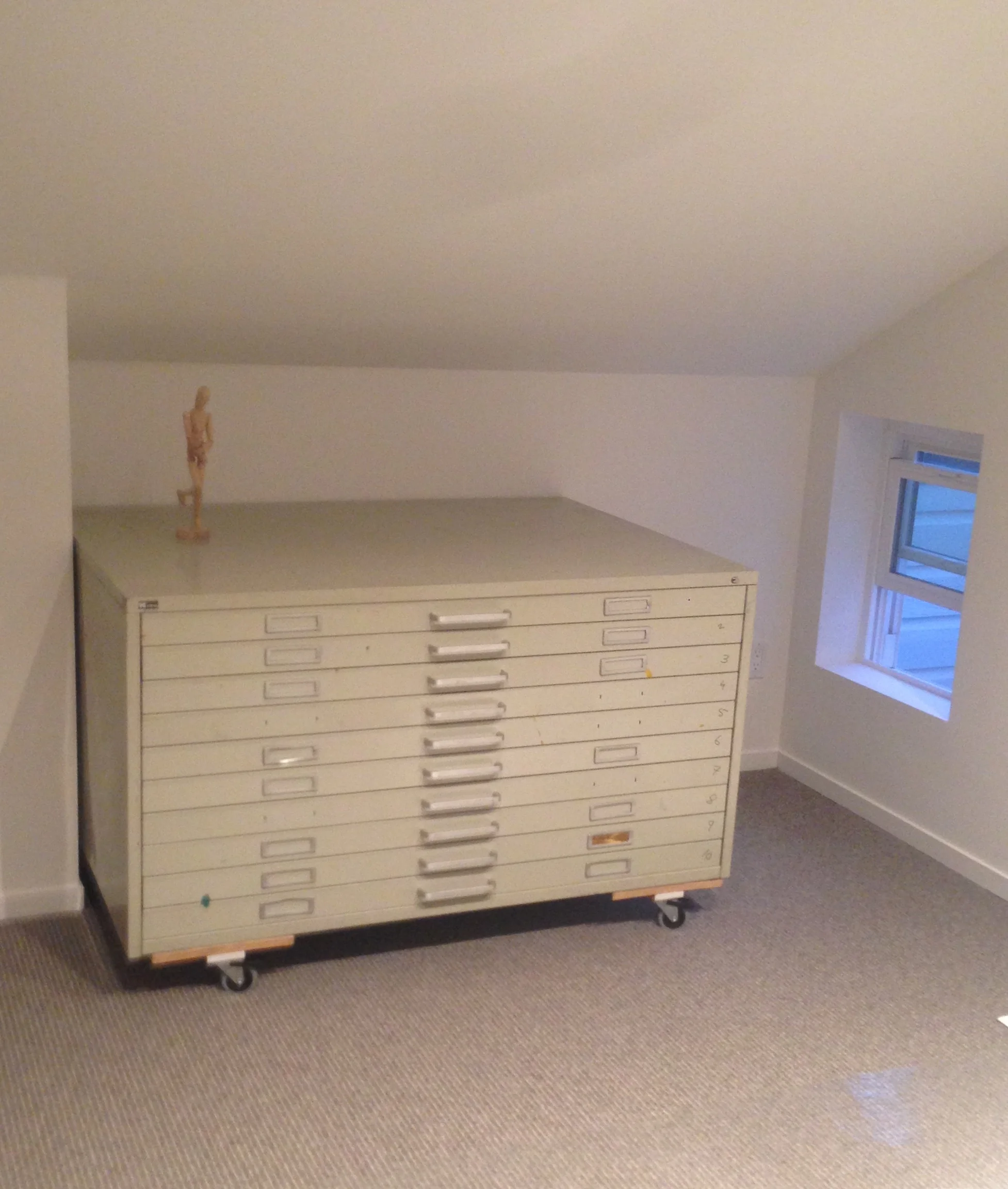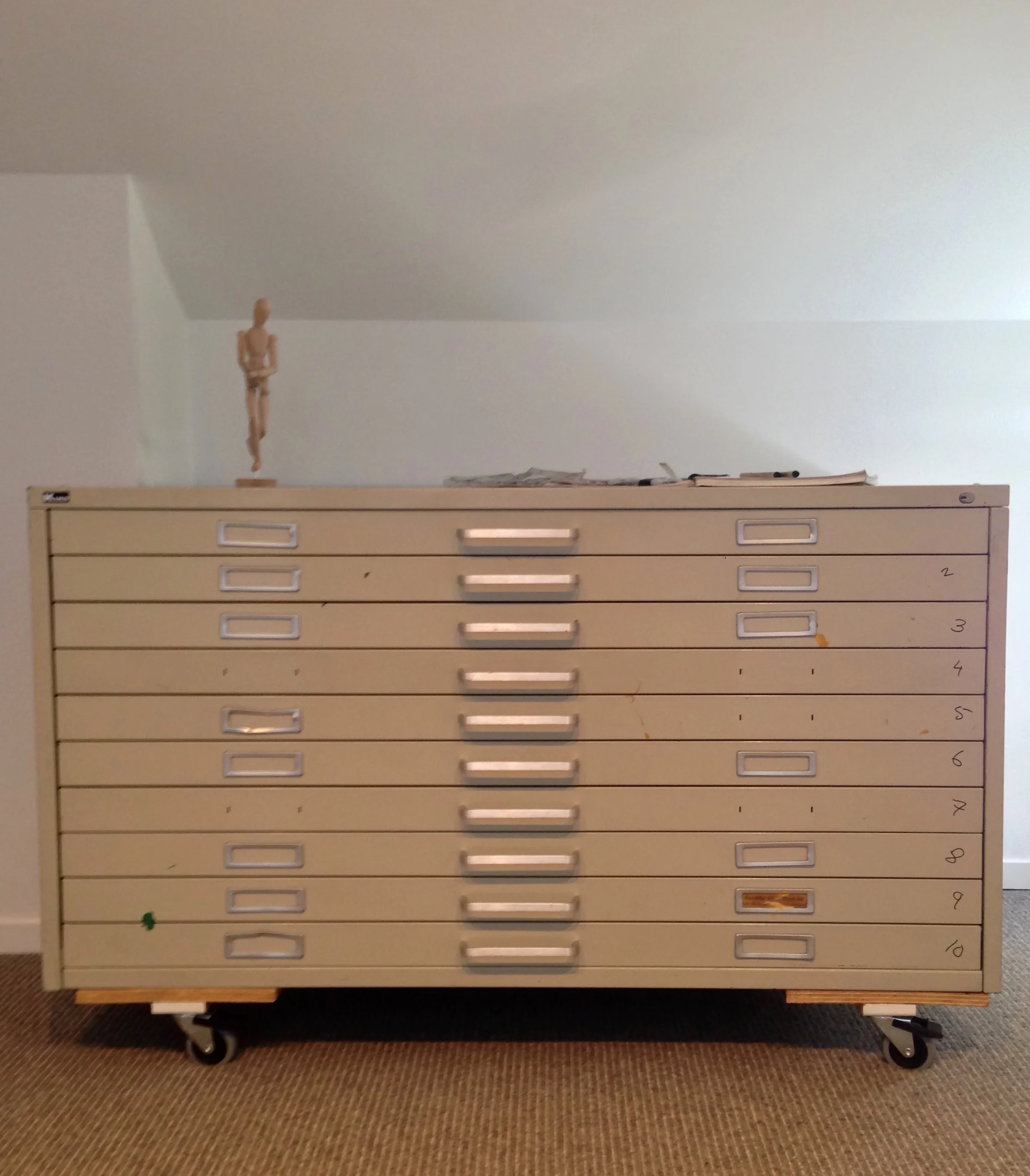I've been missing studio storage for a very long time now, opting to stack my drawings and illustrations in the corner exposed to sunlight and collecting dust. But an extensive and weirdly competitive Craigslist search led me to a beautiful 10 drawer flat file. A beautiful large 10 drawer flat file.